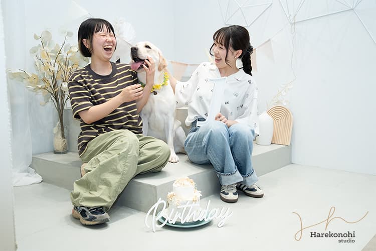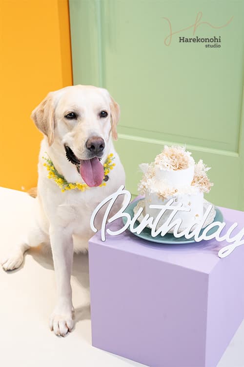 【愛知フォトスタジオ】ペットの誕生日フォトはハレこの日スタジオで|花冠・ケーキ・飼い主さんとの笑顔写真も