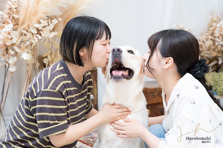 愛知県尾張旭市と春日井市に店舗を構える【ハレこの日スタジオ】のペット撮影プランなら、ペット単独の撮影だけでなく、飼い主さんも一緒に写る「家族写真」も撮影可能です。