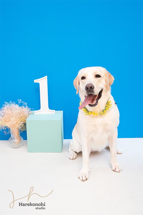 次は、カラフルなブルーの背景に「1」の数字オブジェを合わせた、バースデーフォトセット。元気いっぱいのワンちゃんには、こんな明るい雰囲気もぴったりです。カメラマンが声をかけながら、飼い主さんが近くで見守ることで、自然な笑顔やしぐさを引き出します。