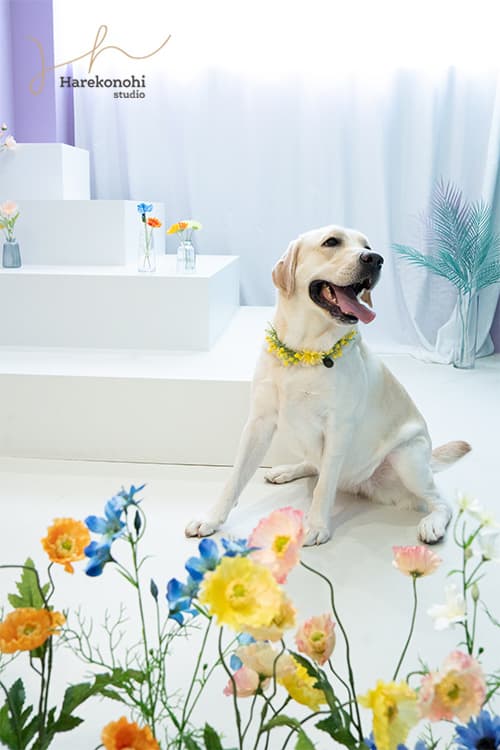 撮影の最初は、スタジオでも人気の「フラワーセット」からスタート。花冠をつけたワンちゃんが、淡いピンクやホワイトの花々に囲まれて登場しました!自然光がやさしく差し込むスタジオ内では、ふんわりとした雰囲気の1枚が完成。