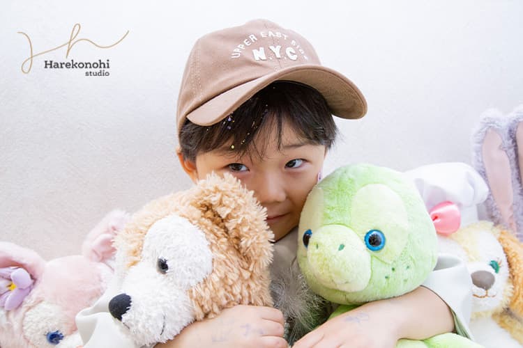 ミニカーにお気に入りのぬいぐるみ。小学生になると遊び方も変わるからこそ、今いちばん夢中になっている“宝物”と一緒に撮るのは、とても価値があります。