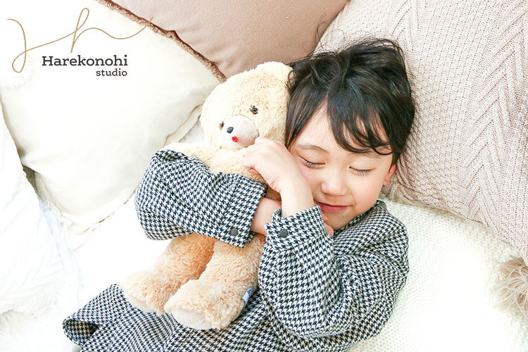 ナチュラルな風合いのブランケットの上に寝転び、くまのぬいぐるみをぎゅっと抱きしめる男の子の写真は、見ているだけで心がやわらぐような一枚です。お子さまのあどけなさや可愛らしさが自然にあふれ、無理のないしぐさのなかに今だけの愛おしさが詰まっています。