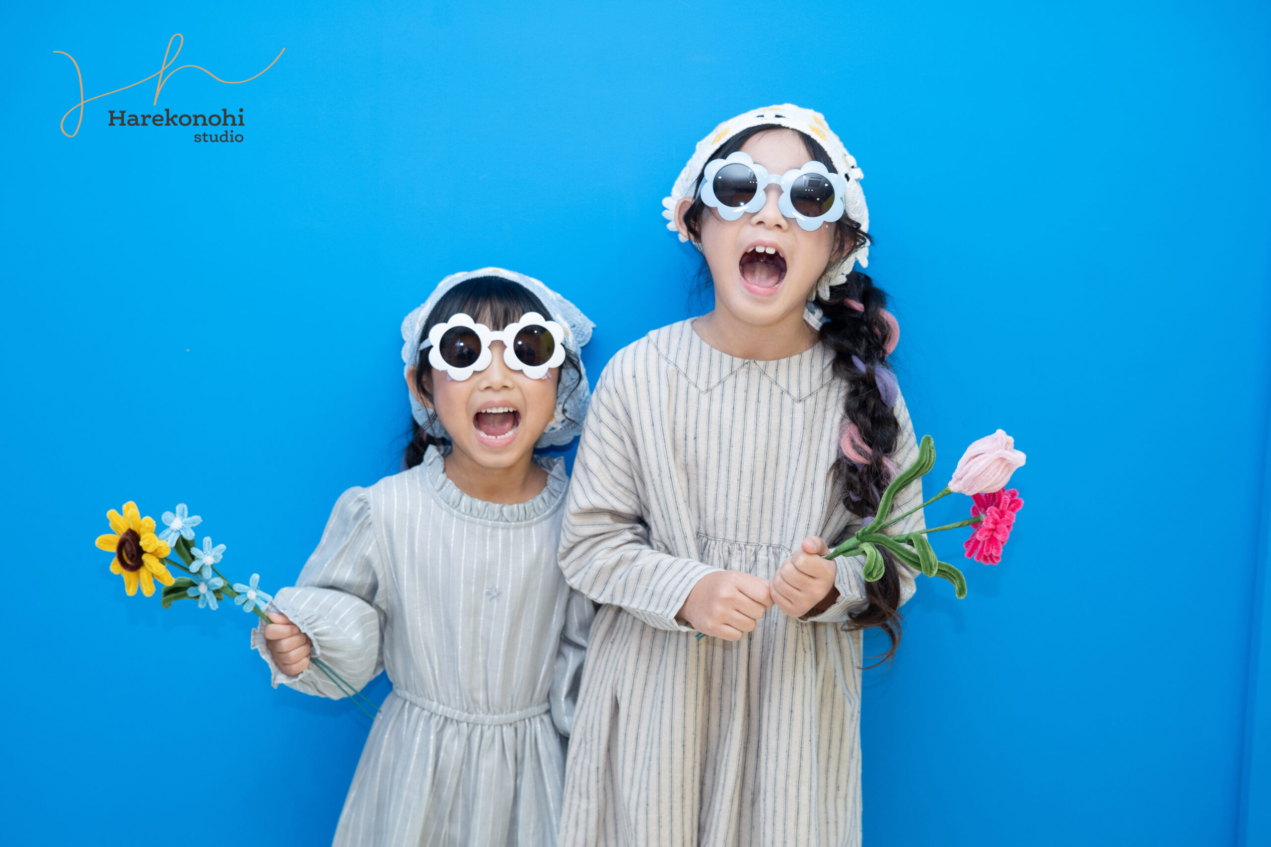 ビビッドなブルーの壁紙を背景に、ファンキーなサングラスをかけた姉妹の写真は、見た瞬間に気分が明るくなるような一枚です。ぱっと目を引く色使いが印象的で、元気いっぱいのお子さまたちの雰囲気をそのまま写し取ったような仕上がりに。
