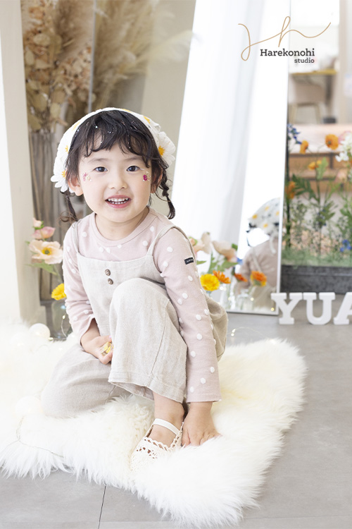 そして、かしこまった衣装や撮影が少し恥ずかしいお子さまにも向いています。フォーマルな衣装だと緊張してしまう子でも、カジュアルな雰囲気なら気持ちがほぐれやすく、いつもの可愛らしさを無理なく写真に写せます。