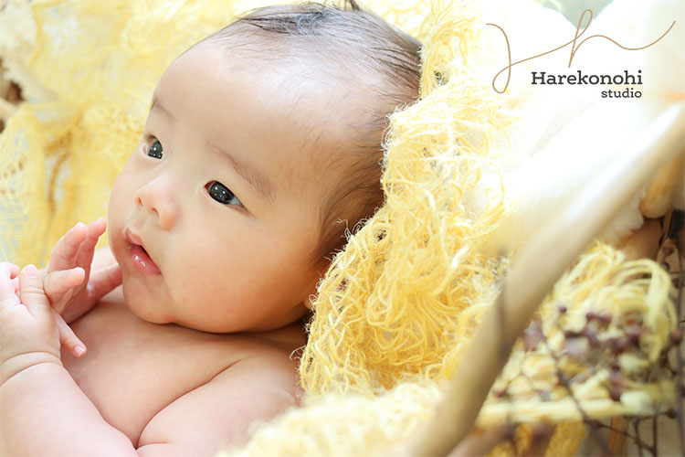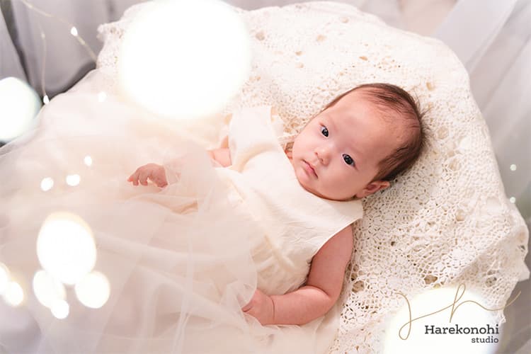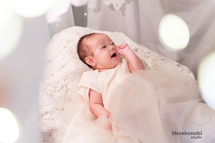 愛知【ハレこの日スタジオ】では、赤ちゃんのペースに合わせながら無理せず撮影を進めるため、初めての方でも安心。泣いたりぐずってしまったり…という際も、うまく表情を切り取りつつ、柔軟に写真撮影いたします。