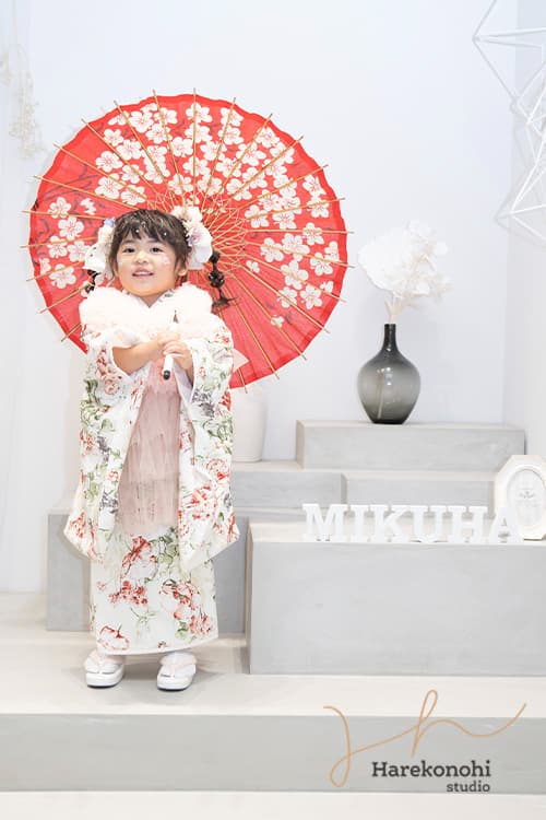 赤い和傘が顔まわりをやさしく縁取り、お子さまの表情をより引き立てます。全身のバランスも美しく残せるため、記念写真として長く楽しめる一枚です。