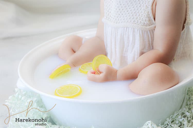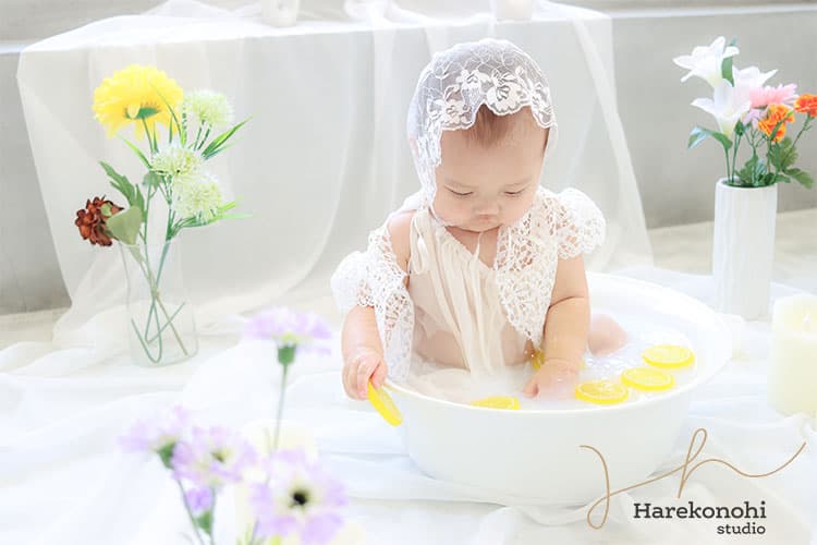 SNSで話題の「ミルクバスフォト」も、【ハレこの日スタジオ】で人気の撮影プラン。ベビーバスにほんのり乳白色のミルク風呂を用意し、お花や葉っぱ、シャボン玉などの小物を浮かべて撮影するこのスタイルは、赤ちゃんの肌の透明感やふんわりとした表情がより引き立つフォトアイデアです。