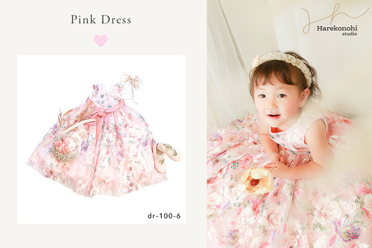 まるでピンクの花束のようなこちらのドレスは、3~4歳のお子さまに大人気。やさしい色合いと透け感が上品で、スタジオの自然光にドレスが映えます。