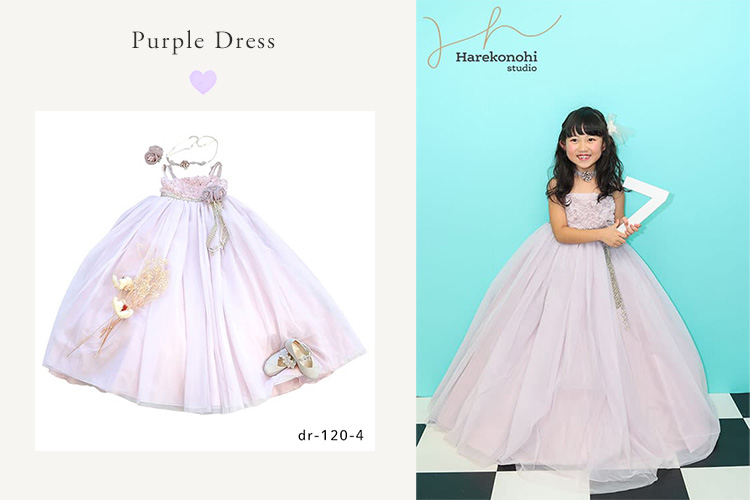 ちょっぴり背伸びをしたい小学生のお子さまには、上品なパープルのロングドレスが人気。ビビッドカラーの背景をバックに、はじける活発さや元気さを表現できます。