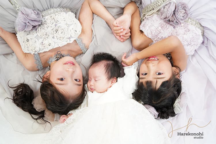「せっかくなら、家族みんなで撮った写真も欲しい」という方も多いでしょう。【ハレこの日スタジオ】では、主役のお子さまだけでなく、パパママやきょうだいと一緒に撮影することも可能です。パパママはカジュアルな服装でもOK。お子さまのドレス姿を囲んで微笑む家族写真は、将来見返したとき、あたたかい気持ちに包まれるはずです。