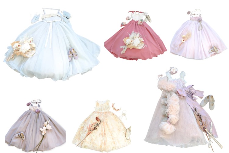 ドレスは、カラー・デザインともにバラエティ豊か。サイズ展開も100cm~120cmと幅広く、3歳前後の小さなプリンセスから、小学校低学年のお姉さんまで対応可能です。