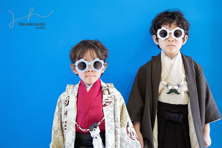 最後は、七五三で来てくれた元気いっぱいの兄弟。まずは、青いポップな壁を背景に撮った写真。鮮やかなブルーが二人の着物を引き立て、はじけるような笑顔が印象的です。
