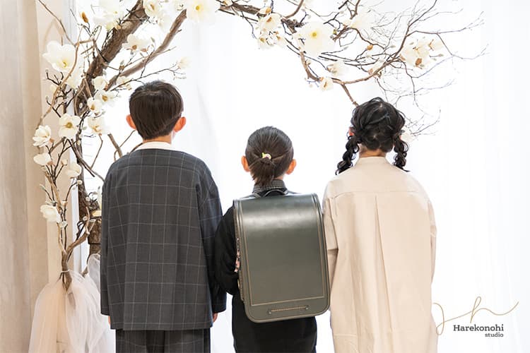 2枚目は、お花をバックに三人の後ろ姿を撮ったショット。ランドセルを背負った弟くんを囲むように、お兄ちゃんと妹ちゃんが寄り添う姿が、きょうだいの成長と絆を感じさせます。