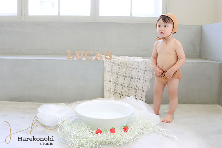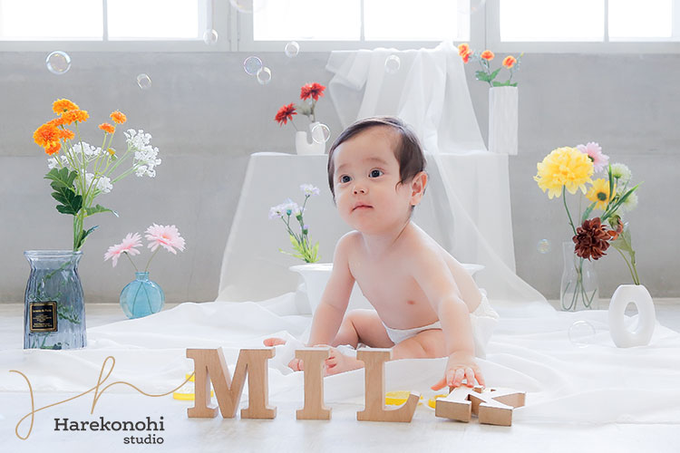 名古屋市近郊のフォトスタジオ【ハレこの日スタジオ】では、1歳誕生日やハーフバースデーにおすすめの「ミルクバスプラン」をご用意しています。かわいい花びらや小物と一緒に、赤ちゃんらしい無邪気な表情を残せる特別なオプションです。